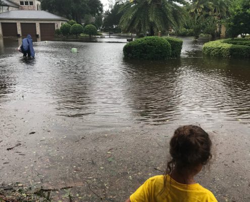 What ensued in the hours of the next morning is nothing short of a nightmare; At least for me and my family. What was already a night of uneasy sleep because we could hear howling wind and pounding rain. All I could think was, “everyone said Jacksonville would be ok, but this doesn’t sound good.” It wasn’t good. The power went out overnight. At 6’clock in the morning my Dad and I started making rounds in the house. They live near the St. John’s River. But, on this particular morning, they lived IN the St. John’s River. It took our eyes moments to adjust to what we were seeing. Water was gushing into the house from the back. It’s true what they say everything does start to move in slow motion. My son was awake and started to ask way too many questions. He was scared. It was becoming clear that if we didn’t leave soon we would be trapped and we might become a lead story somewhere. The water was rising quickly in the front and there was no way to get our cars out of the garage. The brain goes into survival mode. Throw what you need in one bag. Walk through this flood water and get OUT. We could see neighbors slowly peering out and their expressions of disbelief mimicking ours.